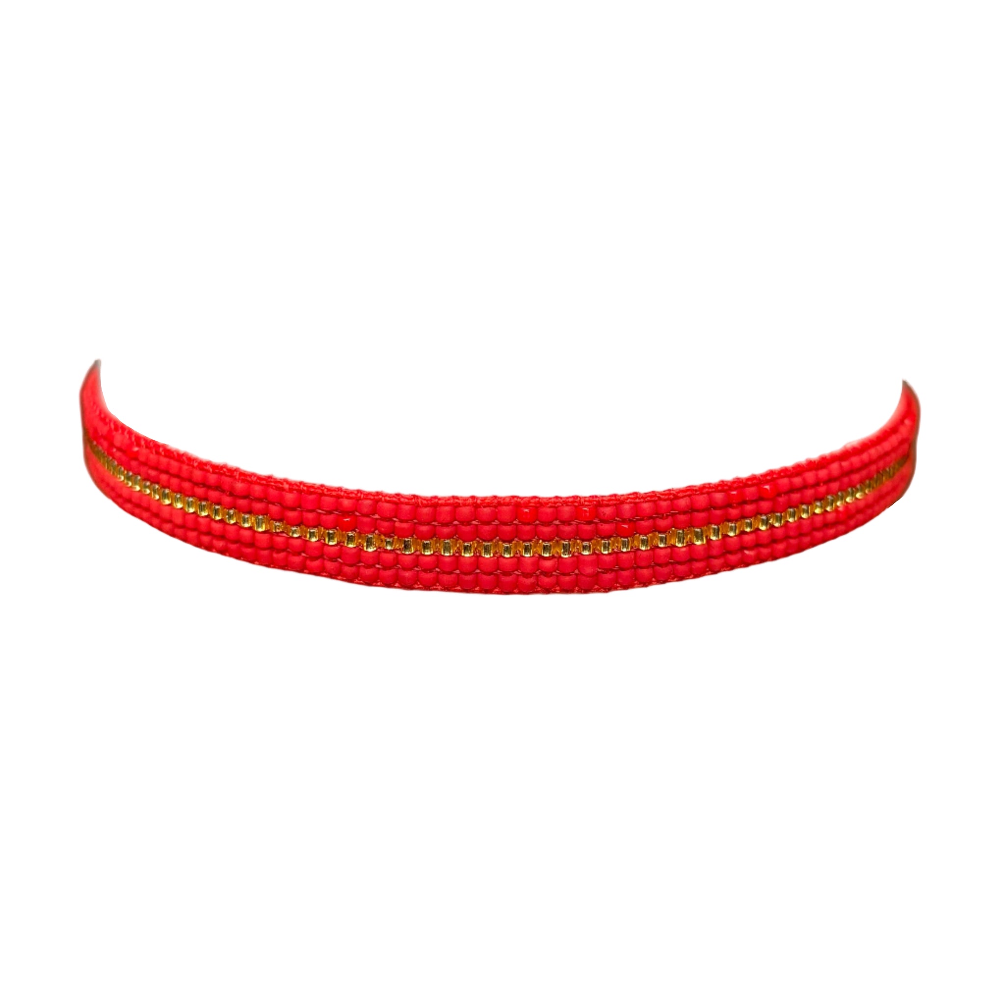 Njengoba yenziwe ngesandla ngobuhlalu obubomvu nobegolide obumangalisayo, Isongo sethu Segolide Elibomvu siwubufakazi obunamandla bamasiko amibalabala ase-Afrika. Ubuhlalu obulukiwe ngobuhlalu ku-loom, leli songo libonisa imigqa emi-5 yobuhlalu obubekwe kahle, ebonisa ubuciko obuyinkimbinkimbi bezingcweti ze-Kioni.